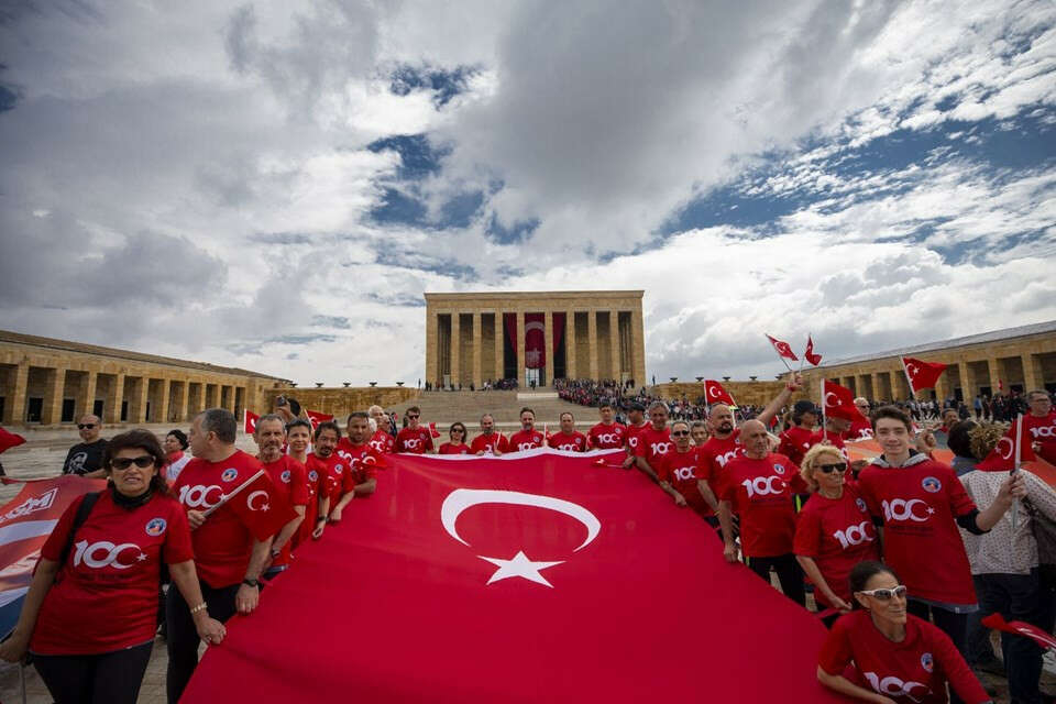 Aslanlı Yol'da yürüyüşe geçen heyet, Atatürk'ün mozolesine çelenk koyarak saygı duruşunda bulundu ve İstiklal Marşı'nı okudu.