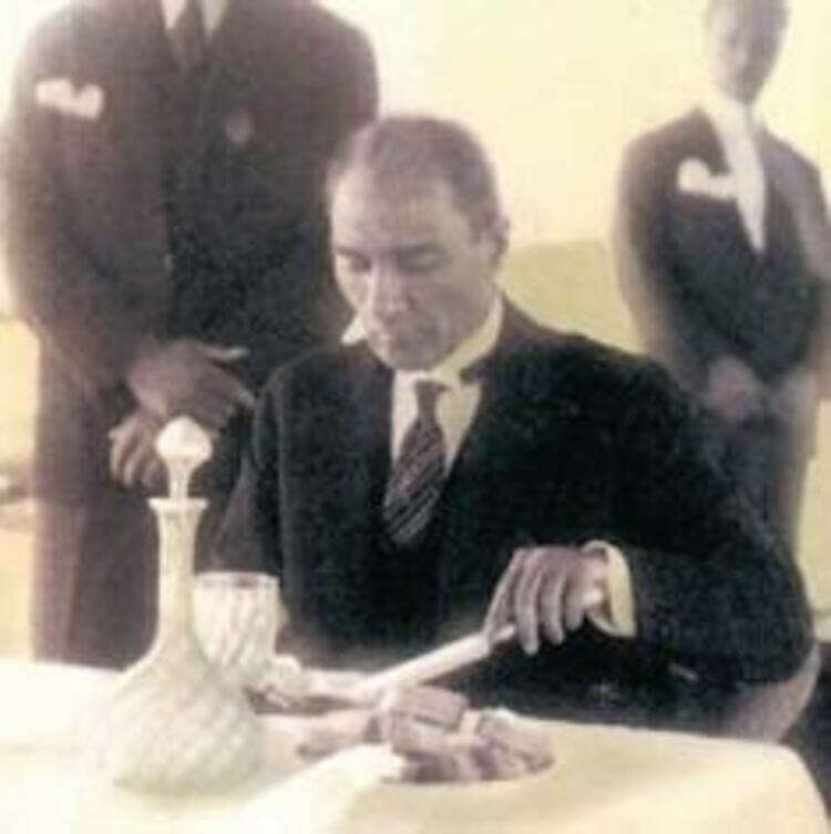 Beslenme Alışkanlıkları ve Sevdiği Yemekler Atatürk, boğazına düşkün, çok yiyen bir insan değildi. Kendisi bir konuşmasında ziyafetlerde çok yemek yenmesini tasarrufa aykırı bulduğunu ve sağlığa zararlı olduğunu söylemiştir. Sabah kahvaltısında; çay, kahve içiyor, fazla bir şey yemiyordu. Soğuk ayranla, bir dilim ekmek yerdi. Bazen bir kâse yoğurt yer, sonra sütlü kahve içerdi. Öğle yemeği: Bir iki dilim ekmek yerdi. Etsiz kuru fasulye, pilav çok sevdiği yemekti. Kuru fasulyeye, "yağlı fasulye" derdi. Ayran ve limonata içiyordu. İki dilim ekmeği ayrana batırarak yiyordu. Yoğurt da ayrıca yiyordu. "Kuru fasulyeye okulda alıştım" demiştir. Kışla yemeği, askerî yemek sayılmıştır kuru fasulye. İkindi üzeri ekmeksiz bir bardak ayran içerdi. Sofradan genellikle doymuş olarak değil, aç kalkarmış. Akşam yemeği: Akşam yemeğinin ayrı bir önemi var. Konuklarıyla birlikte yiyordu. Devlet görevi akşam yemeklerinde devam ediyordu. Omlet seviyormuş, özellikle gece geç saatlerde acıkınca peynirli omlet yermiş. Sahanda yumurta da severmiş. Etli taze bamya de sevdiği yemeklerden. Karnıyarık da severmiş. Onu pilav karıştırarak yermiş. Haşlanmış kuşkonmaz da sevdiği bir yemek. Enginarı hiç yememiş. İstediği halde hiç yiyememiş. Hastayken enginar yemek istemiş. Hatay'dan ısmarlamışlar. Fakat kendisi komaya girmiş ve yiyememiş. Arasıra fava denilen zeytinyağlı, limonlu bakla ezmesinden istediği olurdu. Tatlılarla arası pek iyi değilmiş. Ama gül reçeli severmiş. Kahveyi orta şekerli içermiş. 10-15 fincan içermiş. Meyvalardan kavun seviyormuş. Kavrulmuş, tuzlu leblebi, fıstık da sevdiği yiyeceklerden. Soğan, sarımsak, pastırma gibi kokulu yiyecekleri sevmiyormuş. Çocukluğunda annesinin yaptığı Selanik'in ıspanaklı böreğini çok severmiş.