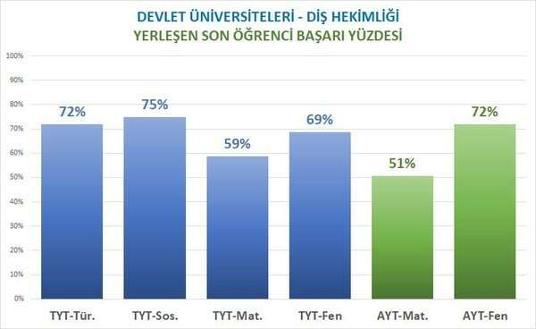 DİŞ HEKİMLİĞİ Başarı sıralaması 80 bin olan diş hekimliğine geçen yıl minimum başarı ile giren öğrencilerin sınav performansı şöyle: TYT Türkçe'de yüzde 72, TYT sosyal bilimlerde yüzde 75, TYT matematikte yüzde 59, TYT fen bilimleri yüzde 69. AYT matematik yüzde 51, AYT fende ise yüzde 72.