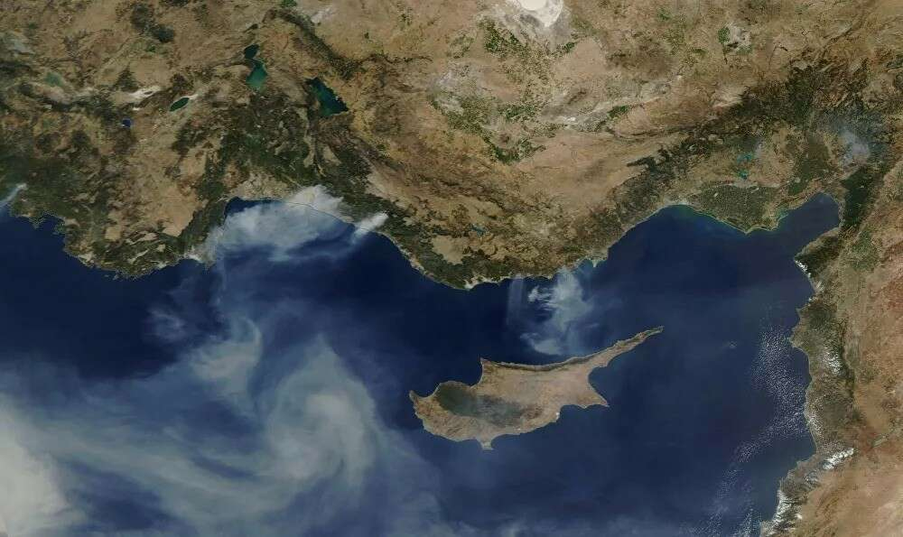 Avrupa Birliği'nin DEFIS uydusu tarafından çekilen görüntüde Mersin'den Kıbrıs'a ve Antalya'dan Akdeniz'e doğru dumanların yükseldiği görüldü