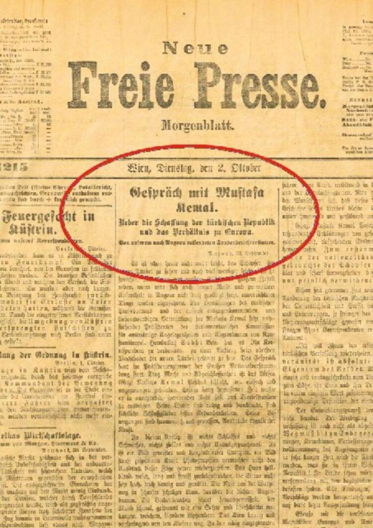 EFENDİLER... AVUSTURYALI muhabir bu özel haberi almanın sevinci içindeydi. Ankara'dan 23 Eylül'de geçtiği haberi Neue Freie Presse 2 Ekim 1923'te "Mustafa Kemal ile mülakat" başlığıyla manşetten duyurdu.