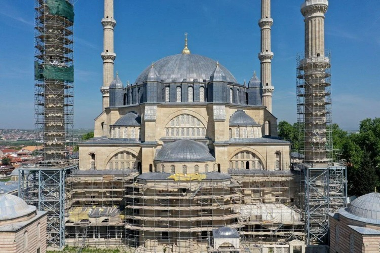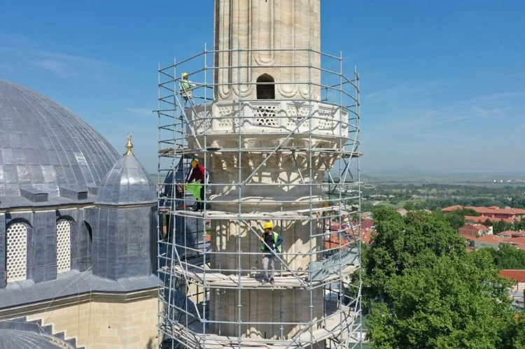 Kalem gibi ince, bir dantel gibi süslü, 3 yollu olarak tasarlandığı için merdivenlerden çıkan 3 kişinin birbirini göremediği 3 şerefeli, alemi dahil 85 metre uzunluğunda dört minareden üçündeki işlemler tamamlandı.