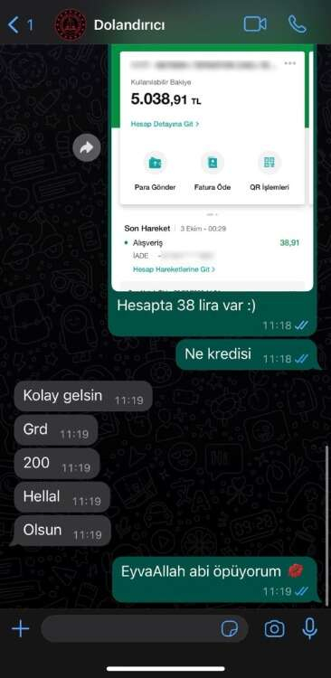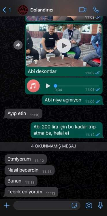 Öfkelenen dolandırıcı ilk önce tepki gösterirken daha sona Çağlar’ı tebrik edip gönderdiği 200 TL’yi de helal ettiğini söyledi.