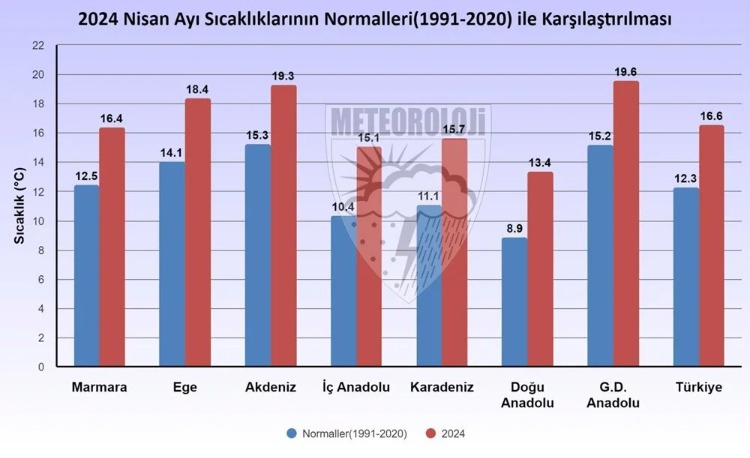 Ortalama sıcaklıklar bütün bölgelerde mevsim normallerinin üzerine çıkarken, İç Anadolu'da 4,7 derece, Karadeniz'de 4,6 derece, Doğu Anadolu'da 4,5 derece, Güneydoğu'da 4,4 derece, Ege'de 4,3 derece, Akdeniz'de 4 derece, Marmara'da 3,9 derece sıcaklık artışı görüldü. Marmara Bölgesi'nin tamamında mevsim normallerinin üzerinde sıcaklık artışı oldu. Uzun yıllar ortalama sıcaklığı 12,5 derece iken, 2024 Nisan ayı 16,4 derece oldu ve 3,9 derece yükseldi.