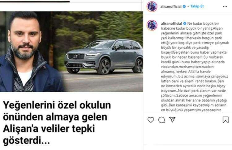 Alişan, tepkisini; "Ne kadar büyük bir haber, ne kadar büyük bir yanlış. Alişan yeğenlerini almaya gitmiş de özel park yeri kullanmış! Herkesin her gün park ettiği yere boş diye park etmeye çalışmak büyük bir ayrıcalık ve yasadışı bir şey! Gerçekten bunu haber yapmak da büyük bir haber başarısı" şeklinde dile getirdi.