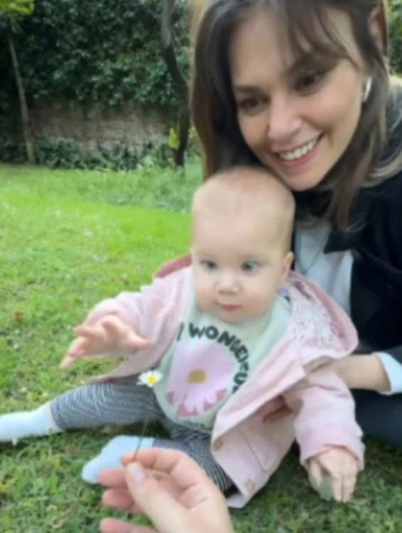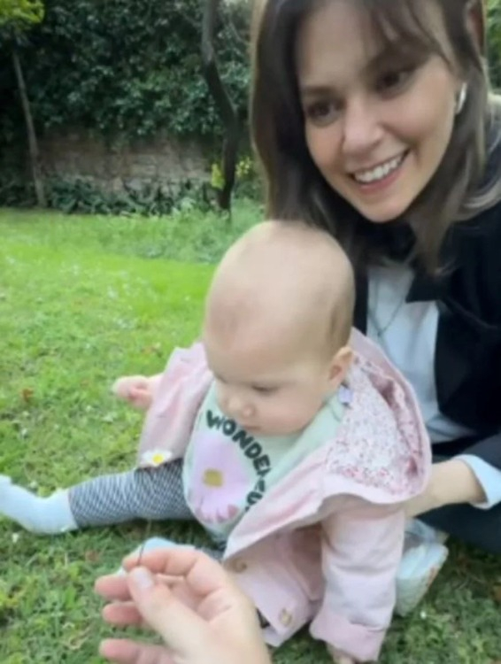 Çimenler içinde keyifli vakit geçiren ünlü çiftten Berkin Gökbudak, kızı Elay'a papatya uzattı.
