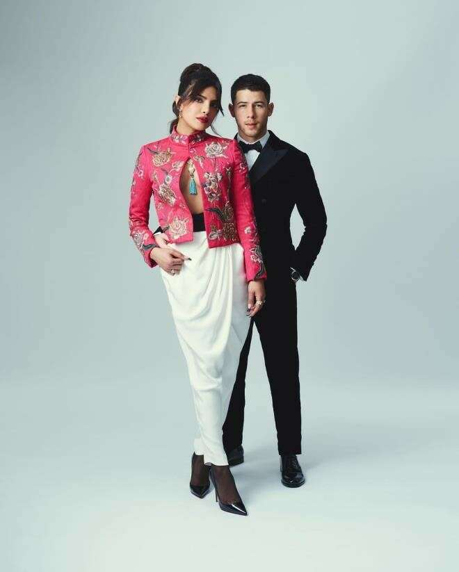 Güzel isim kırmızı halıda Pertegaz imzalı beyaz pantolonlu, pembe çiçekli açık bir ceket, mavi püskül kolye ve siyah topuklu ayakkabılarla boy gösterdi. Kocası Nick Jonas, siyah bir smokin içinde ona eşlik etti.