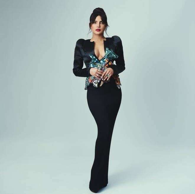 Chopra'nın ikinci kıyafet tercihi de dekolteli oldu. Yıldız isim, törende ortasında çok renkli bir kelebek bulunan siyah dekolteli bir elbiseye geçti.