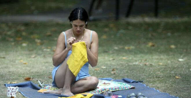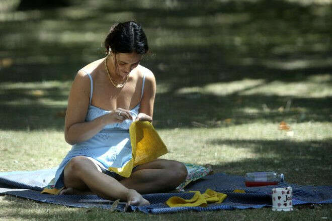 Kendisine gölgelik bir yer bulan Jessica Brown Findlay, örtüsünü sererek, dikiş dikti. Bir yandan da müzik dinlediği görülen Findlay, kahvesini yudumlamayıp, elindeki dikişle objektiflere yakalandı.