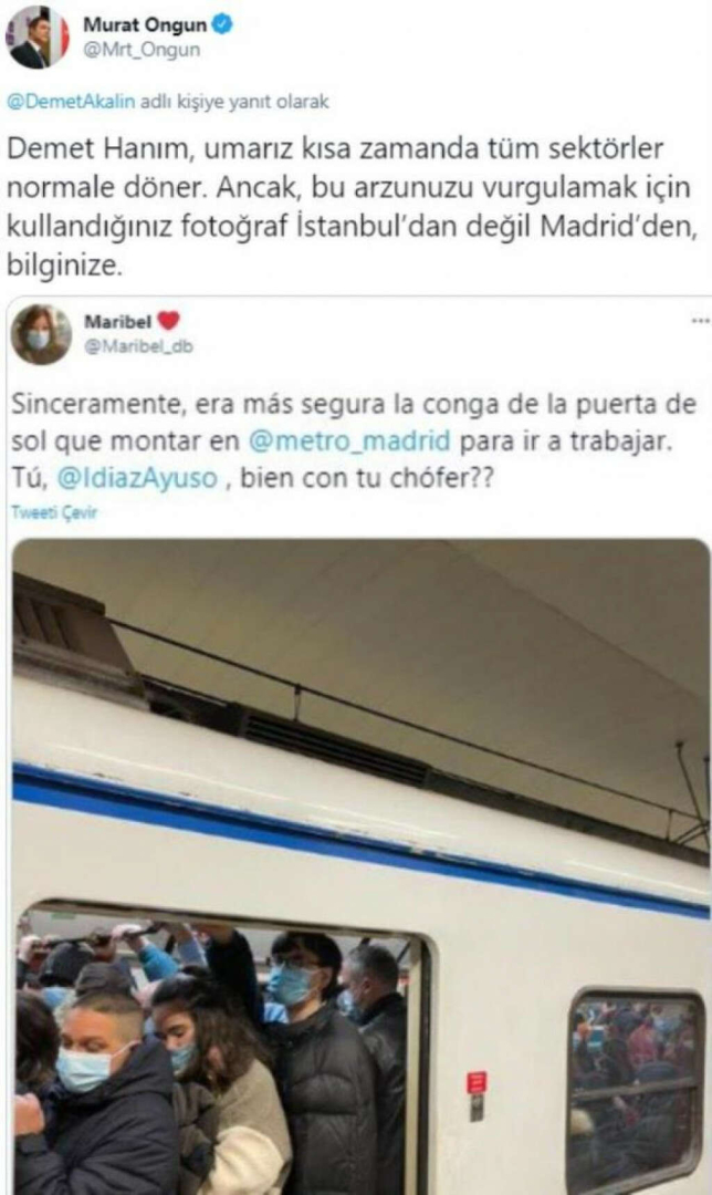Kısa sürede çok sayıda yorum ve beğeni alan fotoğrafa İstanbul Büyükşehir Belediyesi Sözcüsü Murat Ongun da tepkisiz kalamamış ve tüm sektörlerin normale dönmesi temennisinde bulunarak "Ancak, bu arzunuzu vurgulamak için kullandığınız fotoğraf İstanbul'dan değil Madrid'den, bilginize" notuyla Akalın'a cevap vermişti.