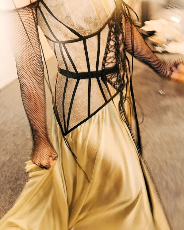 59 yaşındaki Erener'in tercihi sarı renkli, siyah transparan kol detayları ve korse detayı olan bir elbise oldu.