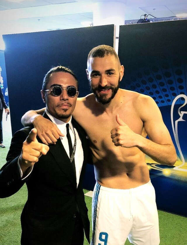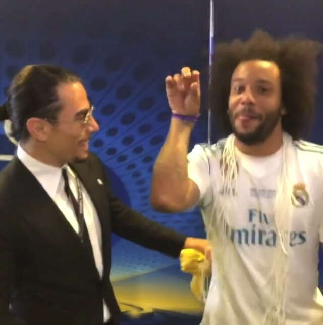 BENZEMA'YI İLK KUTLAYANLAR ARASINDA Nusret, maçtan önce beraber fotoğrafını paylaşarak başarı dilediği Karim Benzema'yı ilk kutlayan isimler arasında yer aldı. Real Madrid'in 3. yıl üst üste Şampiyonlar Ligi'ni kazanmasının ardından kale filelerini hatıra olarak kesen Brezilyalı yıldız Marcelo, Nusret ile birlikte meşhur "tuzlama" hareketini yaptı.