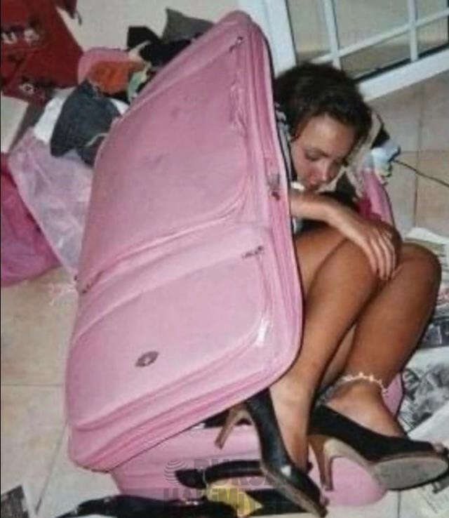 Pembe bir bavulun içinde uyuyakalmayı başaran bir kadın.