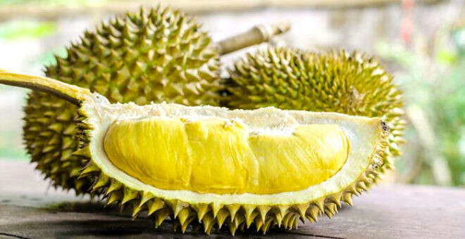 En kötü kokan meyveler arasında gösterilen Durian, 3 kilograma kadar büyüyebiliyor. Meyve, dış kabuğundaki boynuzu andıran çıkıntılarıyla biliniyor.