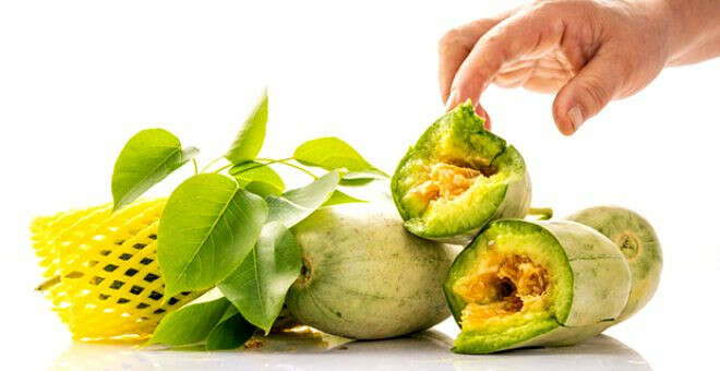 Kiwano olarak da bilinen boynuzlu kavunun tadı; salatalık, kabak, muz ve limon karışımı olarak anlatılıyor. Alanya kavunu olarak da bulunabilir.