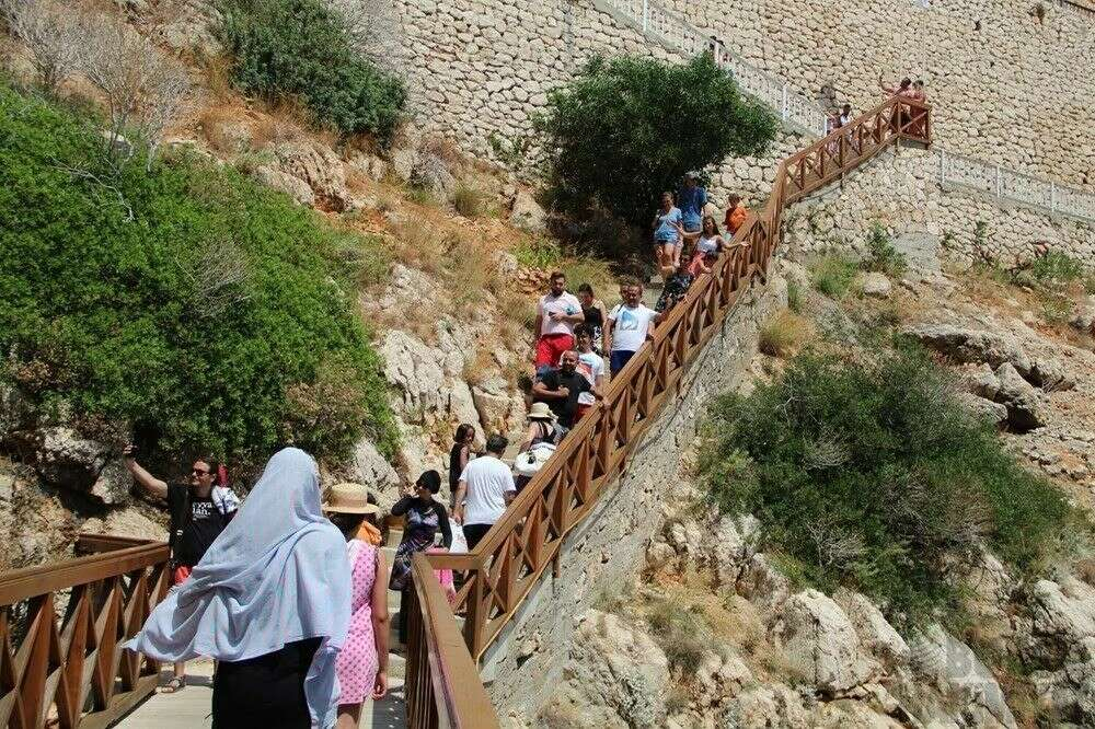 Kaş-Kalkan yolu üzerinde araçlarını yol kenarına park eden ziyaretçiler, daha sonra 187 basamak inerek plaja ulaşıyor.