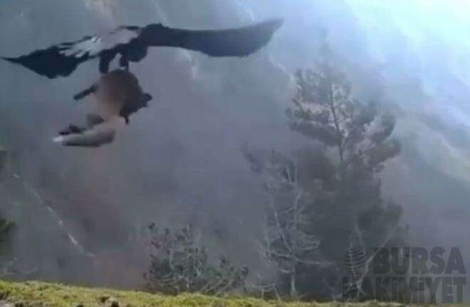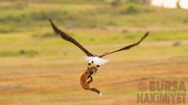 Av listesinde tilkilerin de olduğu kartal, güçlü pençeleriyle etkisiz hale getirdiği avını başka bir yere götürmek için uçuşa geçti.