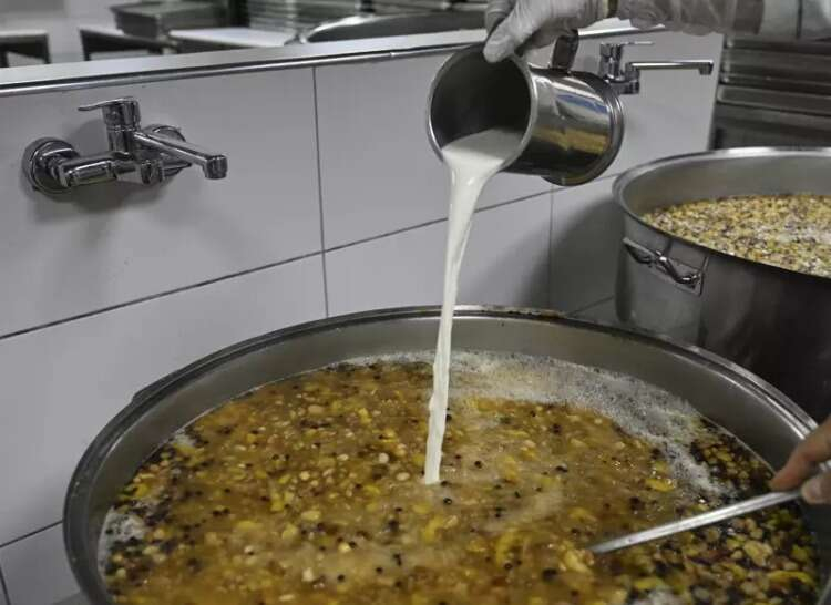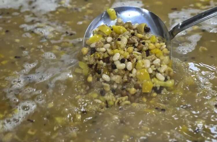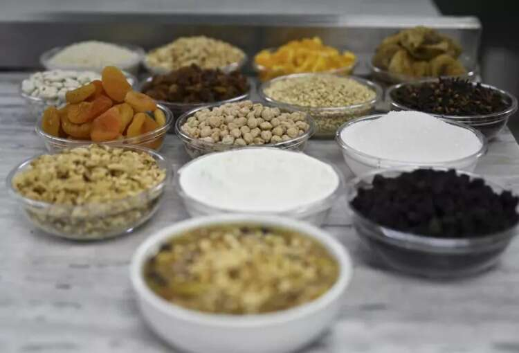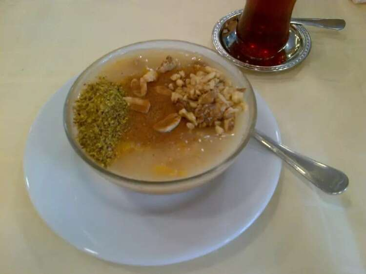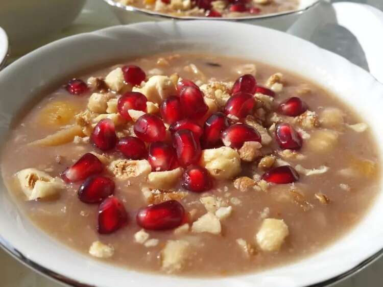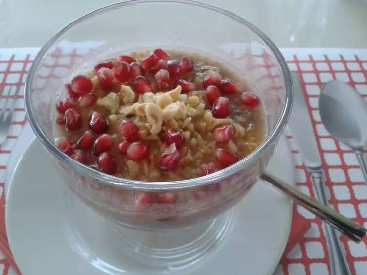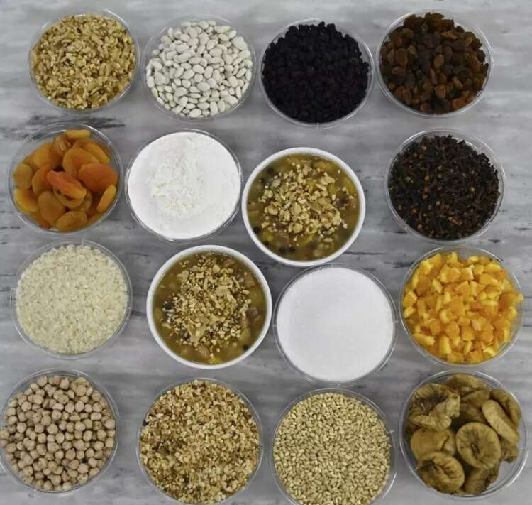 Bu arada fasulyeyi ve nohudu da ayrı ayrı tencerelerde haşlayın. Yumuşayan buğdaya pişmiş nohut, fasulye, küçük doğranmış kayısı, kuru üzüm, yıkanmış pirinç ekleyin ve 15 dakika kadar kaynatın. Sıcak süt, şeker, tuz, fındık, karanfil suyu ekleyerek 15 dakika daha kaynatın.