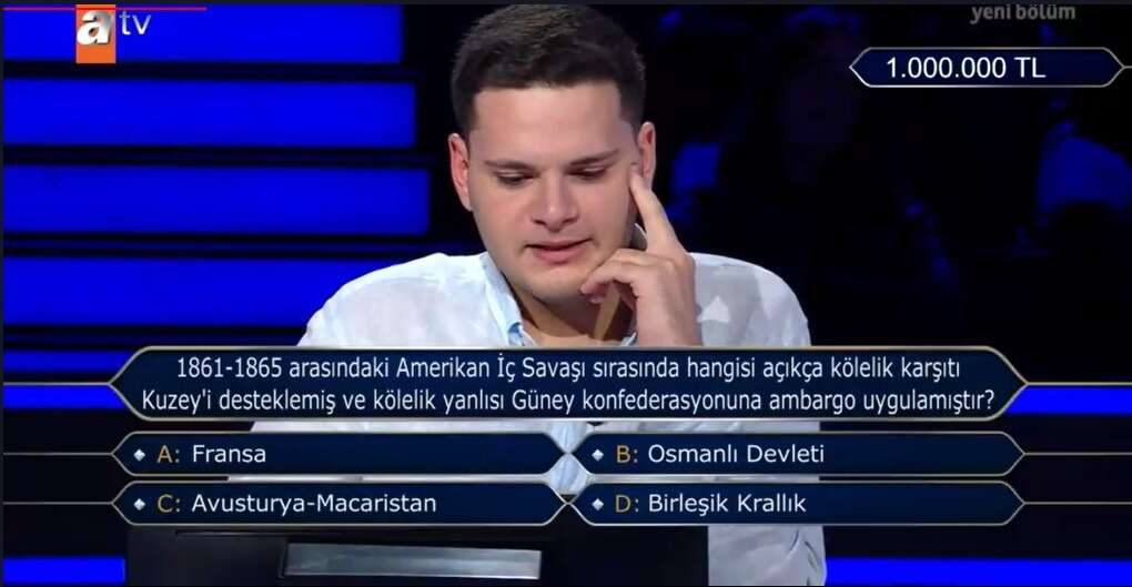 ATV'nin sevilen yarışma programı "Kim Milyoner Olmak İster?", 1 Ekim Pazar günü taptaze bir bölümle seyirci karşısına çıktı. Kenan İmirzalıoğlu'nun karizmatik sunumuyla ilerleyen programda, izleyicilerin ve yarışmacının en çok merak ettiği sorulardan biri Amerikan İç Savaşı hakkındaydı. 1861-1865 arasındaki Amerikan İç Savaşı sırasında hangisi açıkça kölelik karşıtı Kuzey'i desteklemiş ve kölelik yanlısı Güney konfederasyonuna ambargo uygulamıştır? sorusunun cevabı nedir?