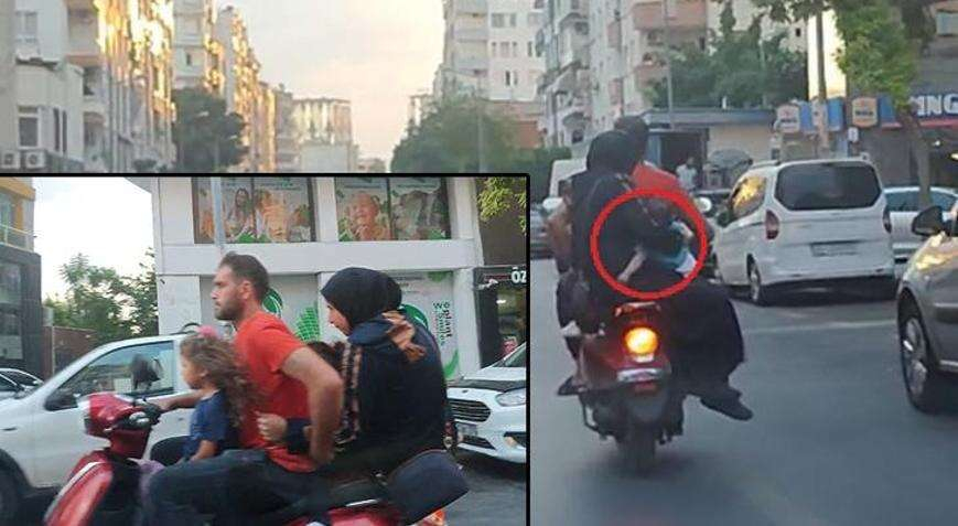 Merkez Akdeniz ilçesi İstiklal Caddesinde seyir halindeki motosiklet faciaya davetiye çıkardı. Cadde üzerinde seyreden motosikleti süren kişinin önünde bir kız çocuğu otururken, arkasında da bir kız çocuğu oturdu. Motosikletin en arka kısmında oturan annenin ise kucağında bebek olduğu görüldü. Trafikte bir süre seyreden motosiklet, daha sonra gözden kayboldu. Bir eliyle motosikletin hakimiyetini sağlayan bir eliyle de arkasındaki çocuğu tutmaya çalışan motosiklet sürücüsünde ve arkasında oturanların kask takmaması dikkat çekti.