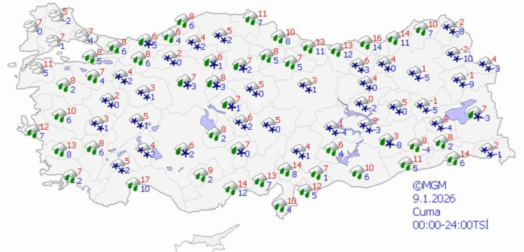 MGM'nin cuma günü için hazırladığı haritalı hava durumu raporuna göre 50 şehirde kar yağışı bekleniyor.
