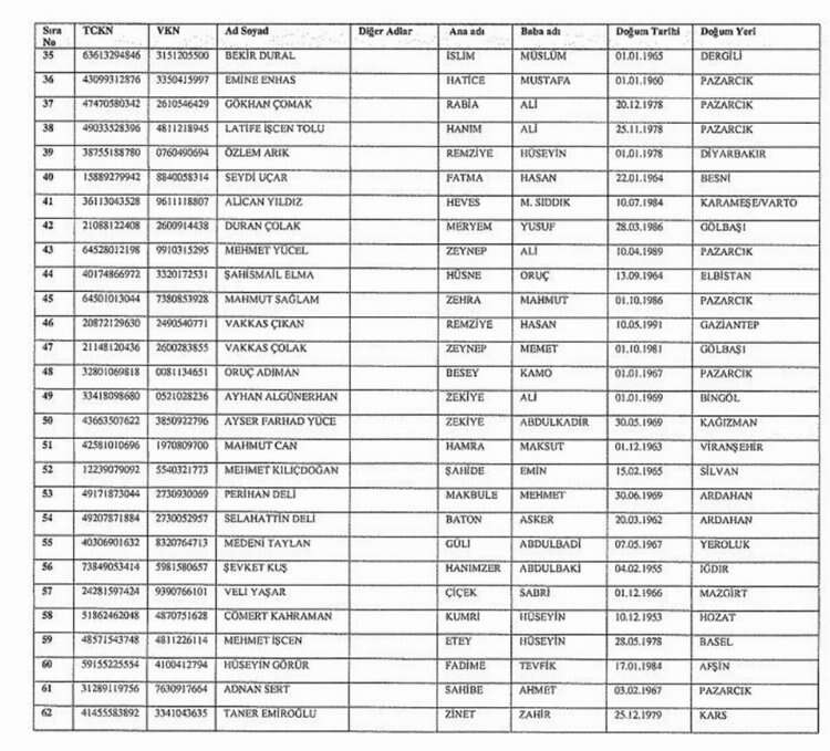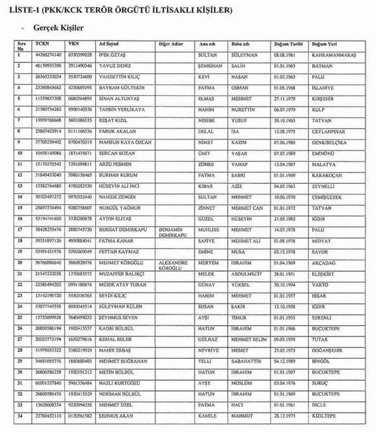 PKK/KCK terör örgütüyle bağlantıları nedeniyle 62 kişinin ve 20 kuruluşun Türkiye'deki malvarlıkları donduruldu. Karar, Resmi Gazete'de yayımlandı.