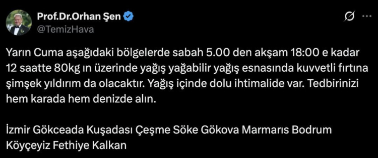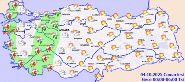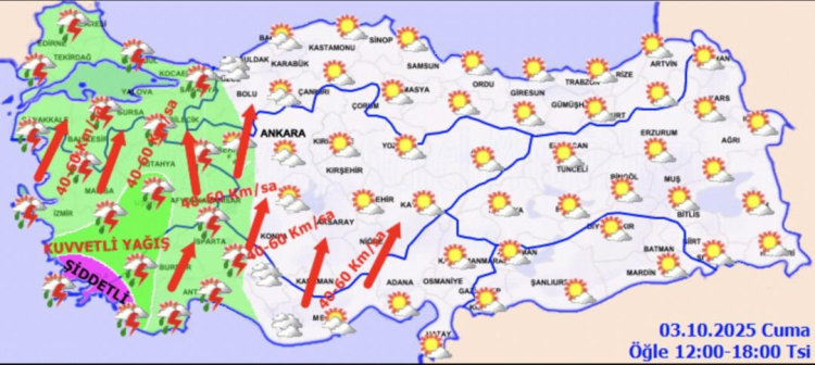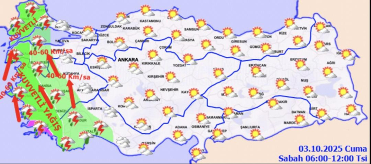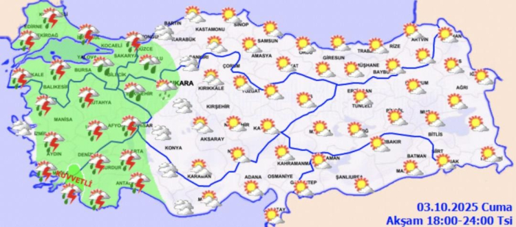 Meteoroloji Genel Müdürlüğü, Marmara'nın batısı ve Ege Bölgesi için kuvvetli sağanak yağış uyarısı yaptı. Muğla kıyılarında çok kuvvetli, yer yer aşırı yağış bekleniyor. Aydın, Balıkesir, Çanakkale, Denizli, Edirne, İzmir, Kırklareli ve Tekirdağ’a sarı kod, Muğla’ya ise turuncu kodlu uyarı verildi. Sel, su baskını, yıldırım ve dolu riskine karşı vatandaşların dikkatli olması gerektiği belirtildi.