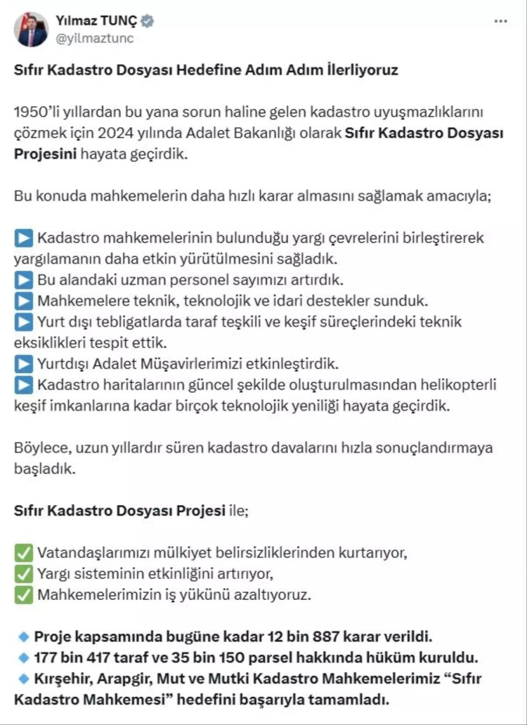 Adalet Bakanı Yılmaz Tunç, sosyal medya hesabından yaptığı açıklamada, 1950'li yıllardan bu yana sorun haline gelen kadastro uyuşmazlıklarını çözmek için 2024 yılında 'Sıfır Kadastro Dosyası Projesi'ni hayata geçirdiklerini belirtti. Bakan Tunç, "Bu konuda mahkemelerin daha hızlı karar almasını sağlamak amacıyla; kadastro mahkemelerinin bulunduğu yargı çevrelerini birleştirerek yargılamanın daha etkin yürütülmesini sağladık. Bu alandaki uzman personel sayımızı artırdık. Mahkemelere teknik, teknolojik ve idari destekler sunduk. Yurt dışı tebligatlarda taraf teşkili ve keşif süreçlerindeki teknik eksiklikleri tespit ettik. Yurt dışı Adalet Müşavirlerimizi etkinleştirdik. Kadastro haritalarının güncel şekilde oluşturulmasından helikopterli keşif imkanlarına kadar birçok teknolojik yeniliği hayata geçirdik. Böylece, uzun yıllardır süren kadastro davalarını hızla sonuçlandırmaya başladık" ifadelerini kullandı.