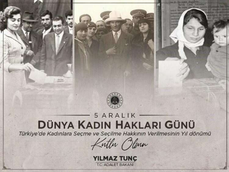 Adalet Bakanı Yılmaz Tunç, "5 Aralık Kadın Hakları Günü'nü ve Türk kadınının seçme ve seçilme hakkını elde etmesinin 89. yılını kutluyorum” ifadelerini kullandı.