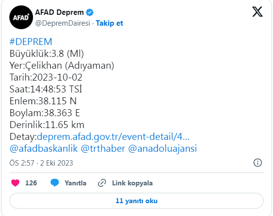 AFAD'dan yapılan açıklamada Adıyaman'ın Çelikhan ilçesinde 3.8 büyüklüğünde bir deprem meydana geldiği bildirildi.