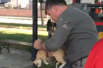 Manisa'nın Salihli ilçesinde tırmandığı ağaçta mahsur kalan kediyi yoldan geçmekte olan bir elektrik dağıtım şirketi ekipleri tarafından kurtardı.