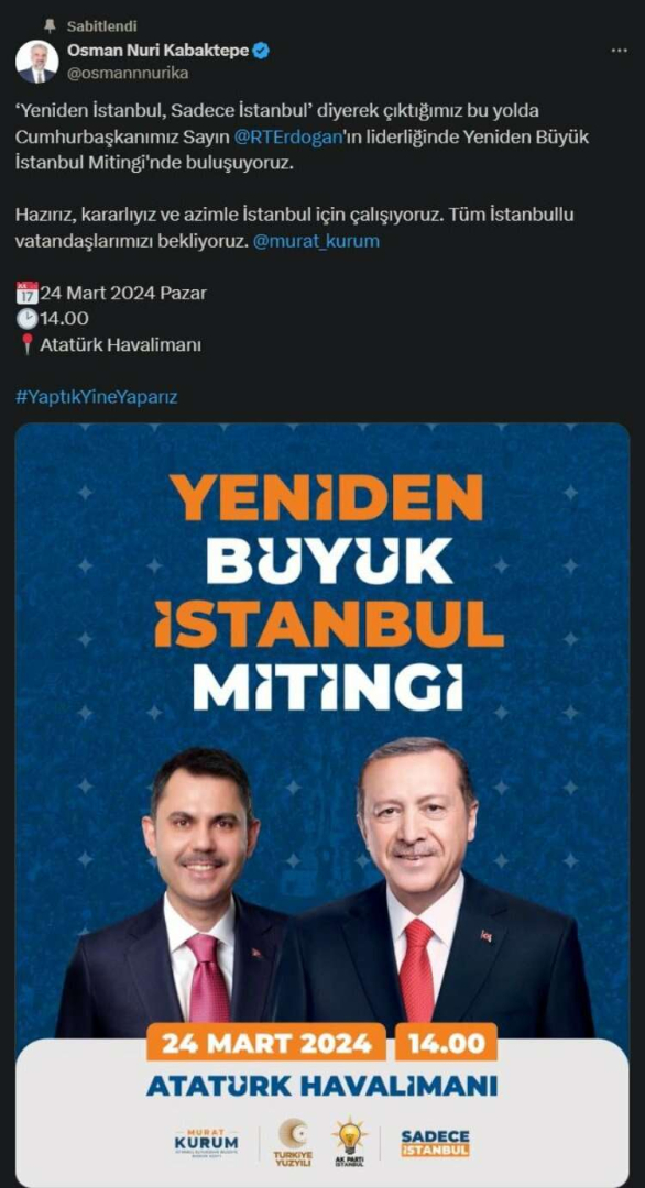 Sosyal medya hesabından takipçilerini bilgilendiren Kabaktepe, İstanbul mitinginin tarih, saat ve yer bilgisini paylaştı.