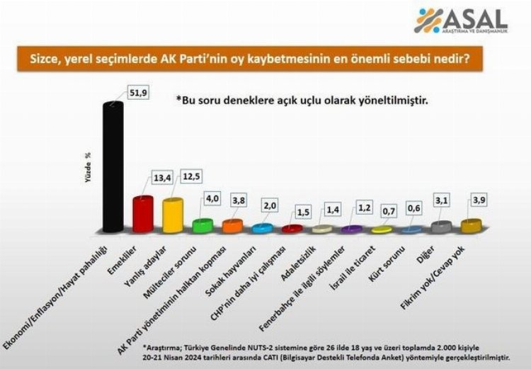 CHP için başarılı bir seçim geride bırakılırken AK Parti'den ise oyların neden düştüğü araştırılmaya başlandı. CHP'nin tarihinde ilk kez AK Parti'yi geride bırakmasının ardından ASAL Araştırmadan dikkat çeken bir anket geldi. "AK Parti’nin yerel seçimlerde oy kaybetmesinin en önemli sebebi sizce nedir?" sorusunu yönelten şirkete verilen cevapların yüzde 51'i ise aynıydı.