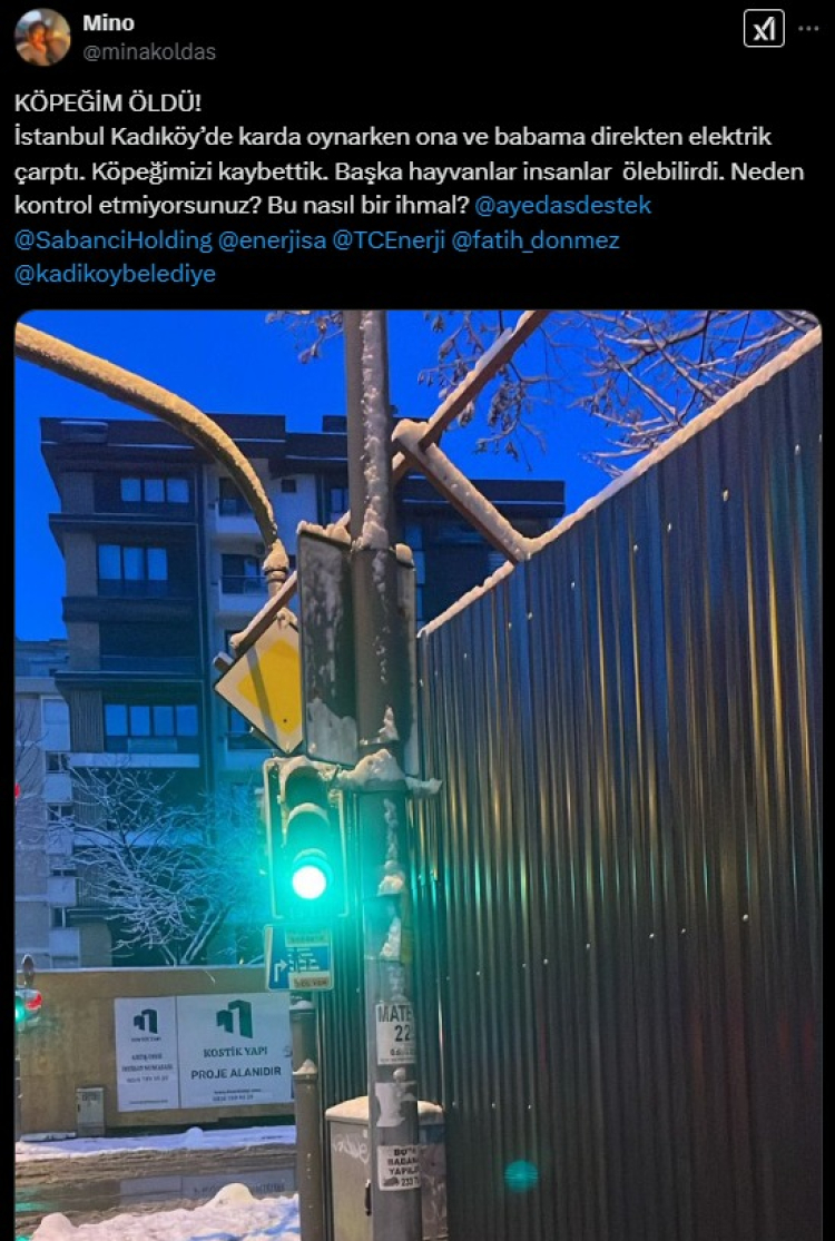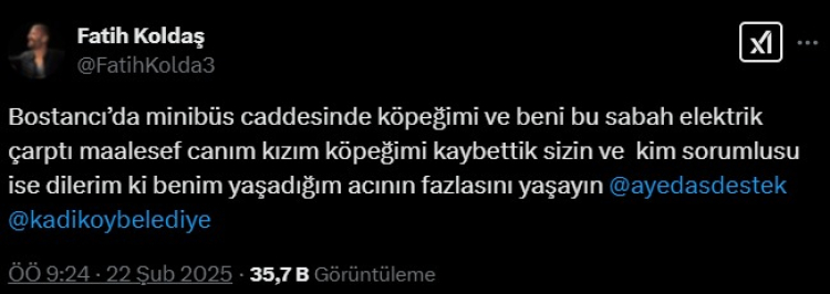 "Bostancı'da minibüs caddesinde köpeğimi ve beni bu sabah elektrik çarptı maalesef canım kızım köpeğimi kaybettik sizin ve kim sorumlusu ise dilerim ki benim yaşadığım acının fazlasını yaşayın" ifadelerini kullandı.