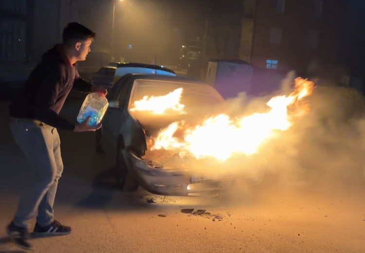 Aksaray'da alev alev yanan araca antifriz döküp söndürmeye çalıştı