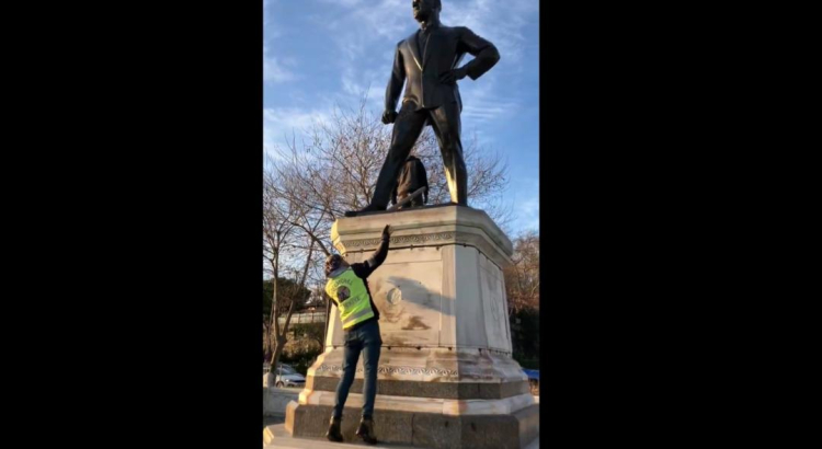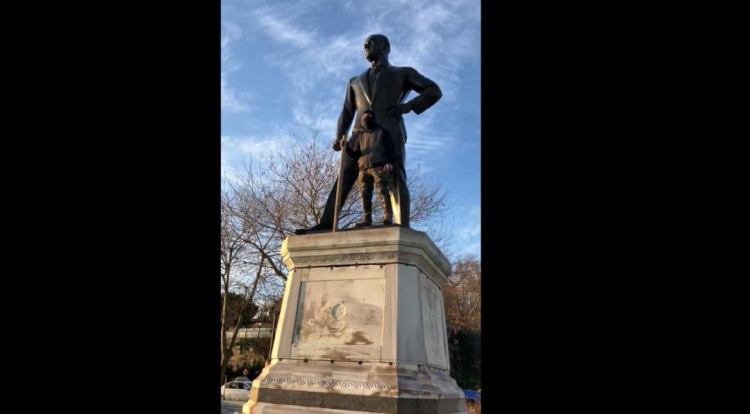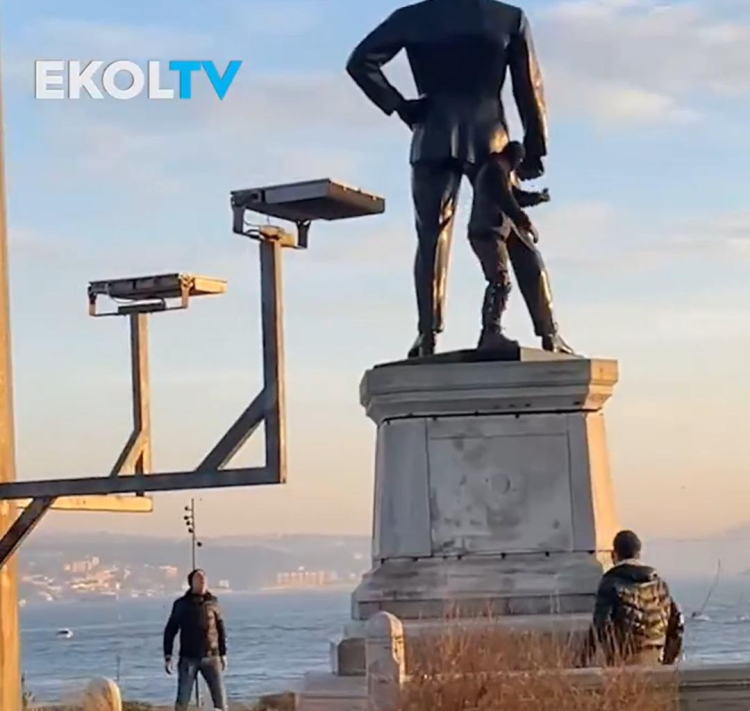 Sosyal medyada hızla yayılan görüntülerde şahsın elinde çekiçle Atatürk heykeli üzerine çıktığı görülüyor.