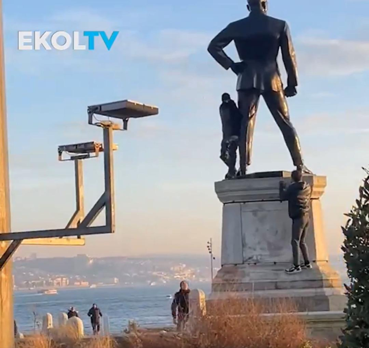 Sarayburnu Parkı'ndan gelen görüntüler akıllara durgunluk verdi. Yüzü maskeli, eli çekiçli şahıs Atatürk heykeline çıkıp sergilediği hareketlerle etraftakilerin tepkisini topladı.