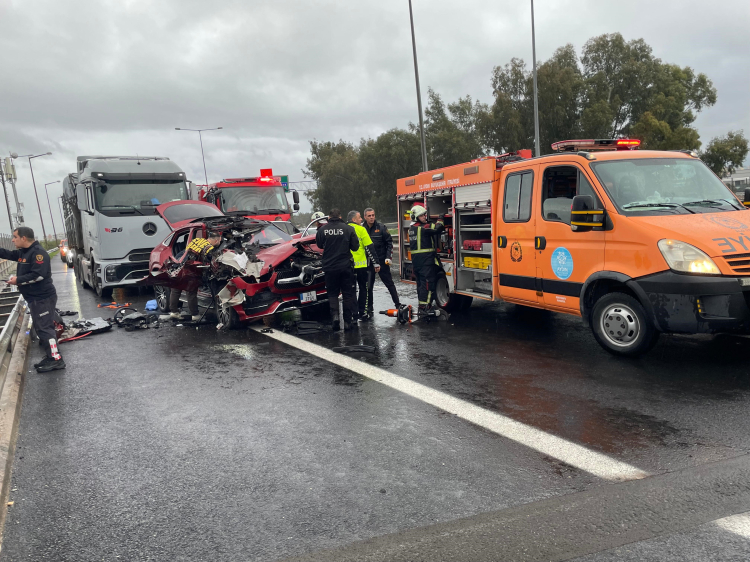 Aydın-İzmir Otoyolu'nda seyir halindeyken tıra arkadan çarpan lüks otomobil hurdaya döndü, 2 kişi yaralandı. Araçta sıkışan yolcu, ekiplerin çalışmasıyla kurtarıldı.