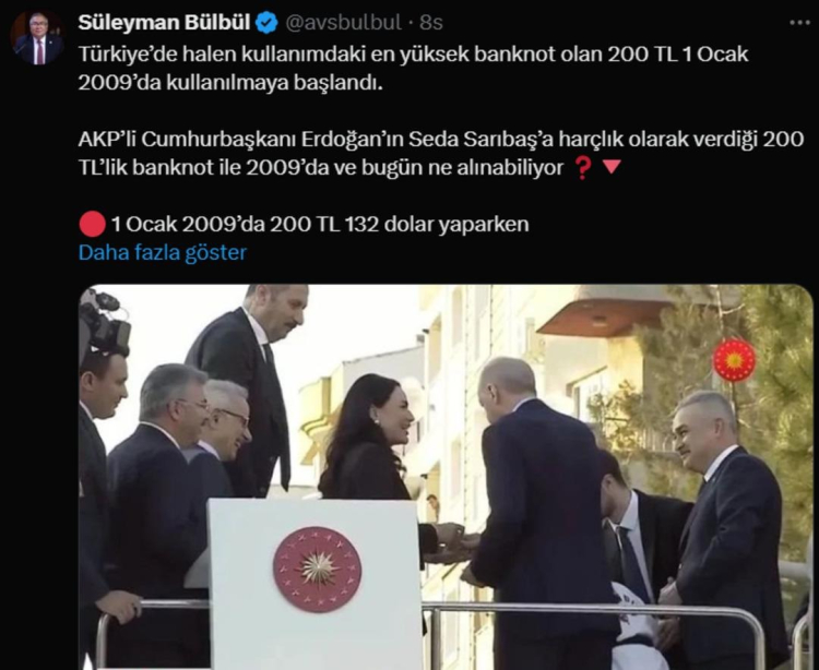 Doları, Euroyu, altını, eti, tavuğu bir kenara bırakalım. Seda Hanım bu 200 TL ile bir kahveyi bile zor alır. AKP’nin liyakatsiz kadroları ve iş bilmezliğinin Türkiye’yi sürüklediği ekonomik kriz işte budur!"