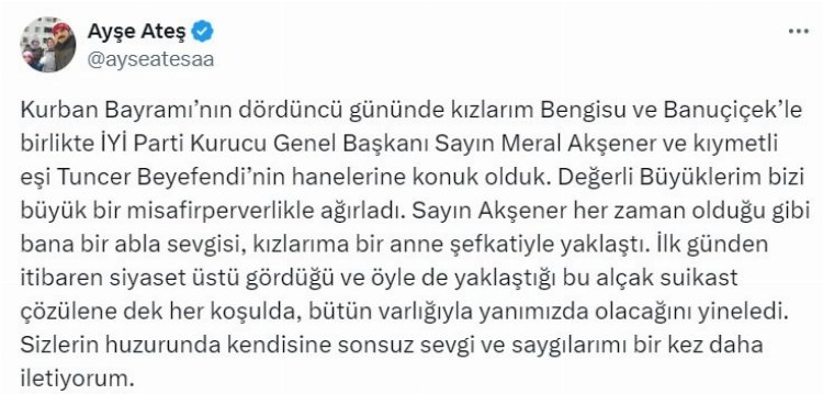 "Kurban Bayramı’nın dördüncü gününde kızlarım Bengisu ve Banuçiçek’le birlikte İYİ Parti Kurucu Genel Başkanı Sayın Meral Akşener ve kıymetli eşi Tuncer Beyefendi’nin hanelerine konuk olduk. Değerli Büyüklerim bizi büyük bir misafirperverlikle ağırladı. Sayın Akşener her zaman olduğu gibi bana bir abla sevgisi, kızlarıma bir anne şefkatiyle yaklaştı. İlk günden itibaren siyaset üstü gördüğü ve öyle de yaklaştığı bu alçak suikast çözülene dek her koşulda, bütün varlığıyla yanımızda olacağını yineledi.