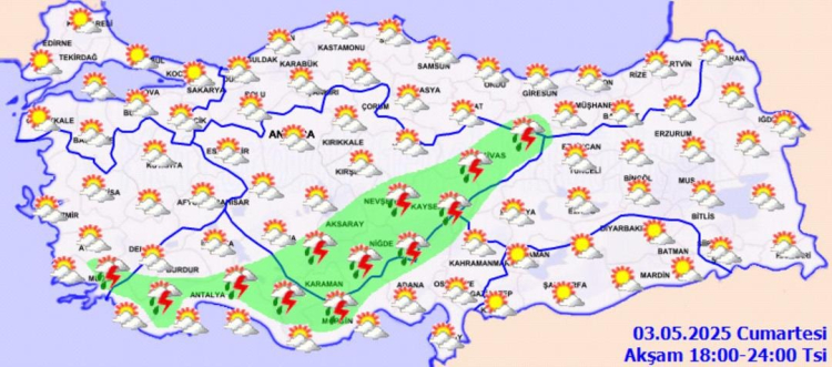 KUVVETLİ YAĞIŞ UYARISI: Yağışların; öğleden sonra Akdeniz'in iç kesimleri, Karaman, Aksaray, Nevşehir, Niğde ve Kayseri çevreleri ile Konya ve Sivas'ın güney ilçelerinde yerel kuvvetli olması beklendiğinden dikkatli ve tedbirli olunması gerekmektedir.