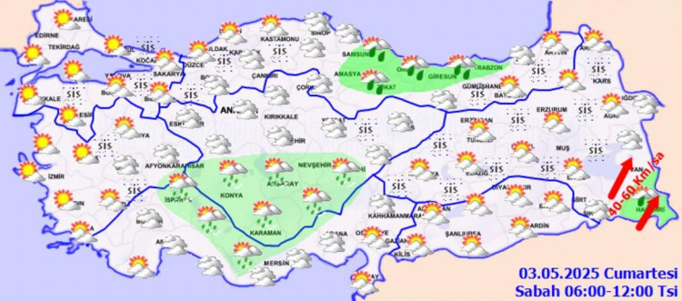 RÜZGAR: Batı kesimlerde kuzeyli, doğu kesimlerde güneyli yönlerden hafif ara sıra orta kuvvette, Doğu Anadolu’nun güneydoğusunda güney yönlerden kuvvetli olarak (40-60 km/saat) esmesi bekleniyor.