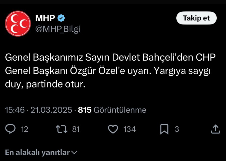 Milliyetçi Hareket Partisi'nin sosyal medya hesabından yapılan paylaşımda, Devlet Bahçeli'nin Özgür Özel'e yönelik "Yargıya saygı duy, partinde otur" dediği belirtildi.