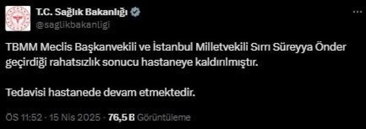Sağlık Bakanlığı'nın resmi sosyal medya hesabından yapılan paylaşımda da, "TBMM Meclis Başkanvekili ve İstanbul Milletvekili Sırrı Süreyya Önder geçirdiği rahatsızlık sonucu hastaneye kaldırılmıştır. Tedavisi hastanede devam etmektedir" ifadeleri kullanıldı.