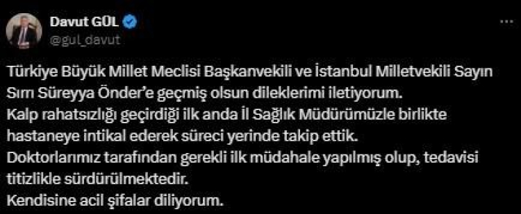 İstanbul Valisi Davut Gül ise yaptığı açıklamada, "Türkiye Büyük Millet Meclisi Başkanvekili ve İstanbul Milletvekili Sayın Sırrı Süreyya Önder'e geçmiş olsun dileklerimi iletiyorum.