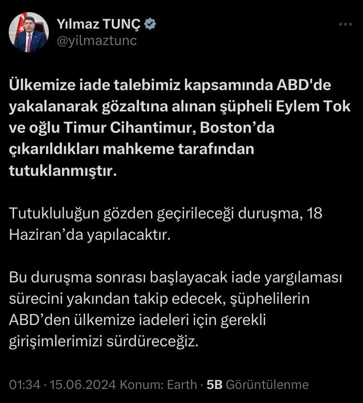 Adalet Bakanı Yılmaz Tunç, sosyal medya hesabından yaptığı paylaşımda, “Ülkemize iade talebimiz kapsamında ABD'de yakalanarak gözaltına alınan şüpheli Eylem Tok ve oğlu Timur Cihantimur, Boston’da çıkarıldıkları mahkeme tarafından tutuklanmıştır. Tutukluluğun gözden geçirileceği duruşma, 18 Haziran’da yapılacaktır. Bu duruşma sonrası başlayacak iade yargılaması sürecini yakından takip edecek, şüphelilerin ABD’den ülkemize iadeleri için gerekli girişimlerimizi sürdüreceğiz” dedi.