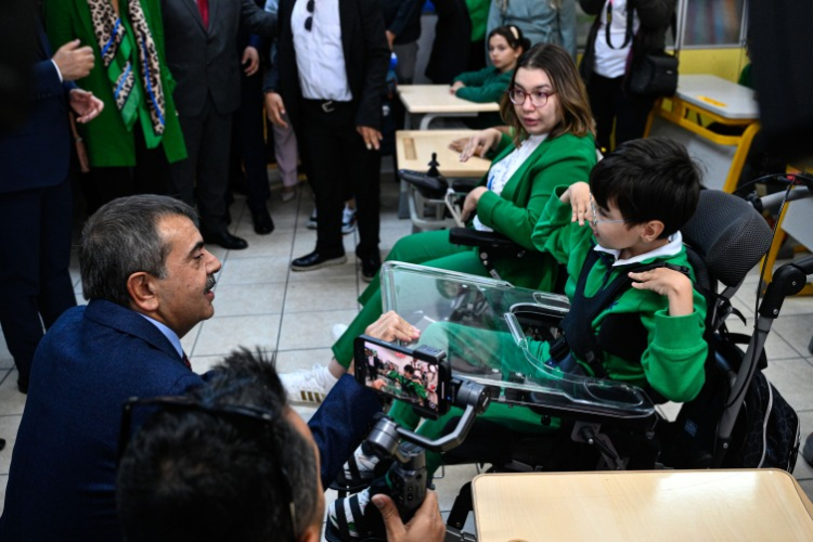 Milli Eğitim Bakanı Yusuf Tekin ile Tarım ve Orman Bakanı İbrahim Yumaklı, okula yaptıkları ziyarette özel gereksinimli öğrenciler tarafından çiçeklerle karşılandı.