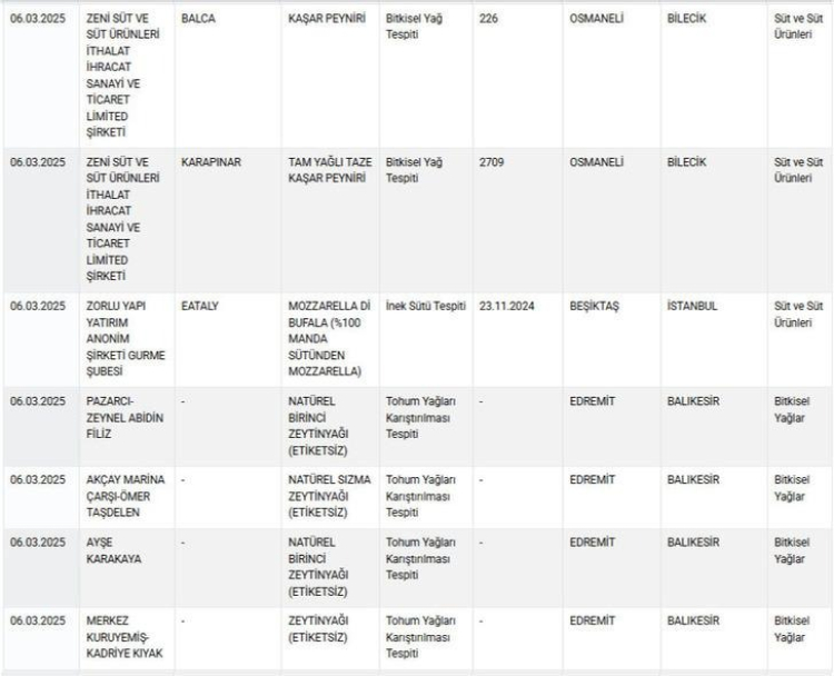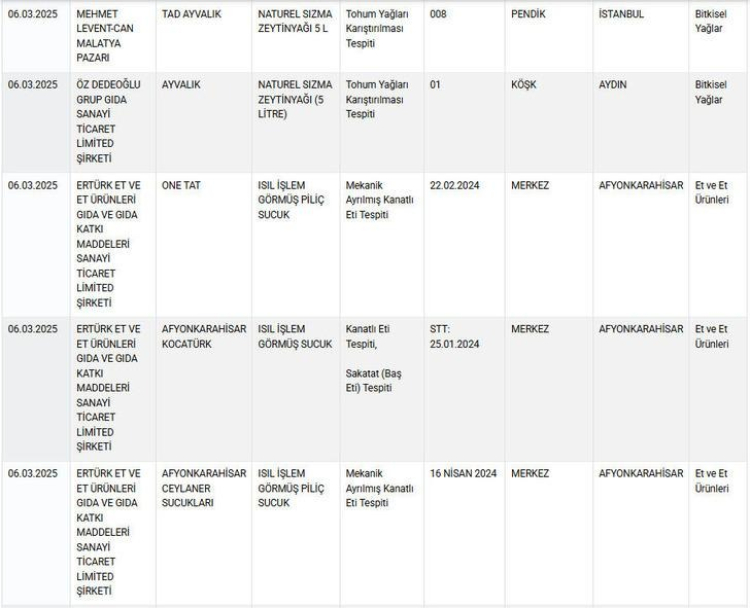 Tarım ve Orman Bakanlığı, taklit ve tağşiş yapıldığı tespit edilen gıda ürünlerinin listesini güncelledi.