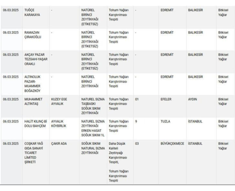 Bakanlığın ifşa listesinde en dikkat çeken ürünlerden biri de zeytinyağı oldu. Doğallığıyla bilinen zeytinyağına tohum yağları ve düşük kaliteli zeytinyağları karıştırıldığı belirlendi. Bu durum, hem kaliteyi düşürmekte hem de tüketiciyi yanıltarak büyük bir güven kaybına yol açmaktadır.