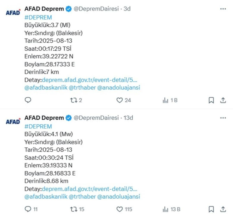 AFAD'ın verilerine göre, Sındırgı'da gerçekleşen iki depremin büyüklükleri 4.1 ve 3.8.